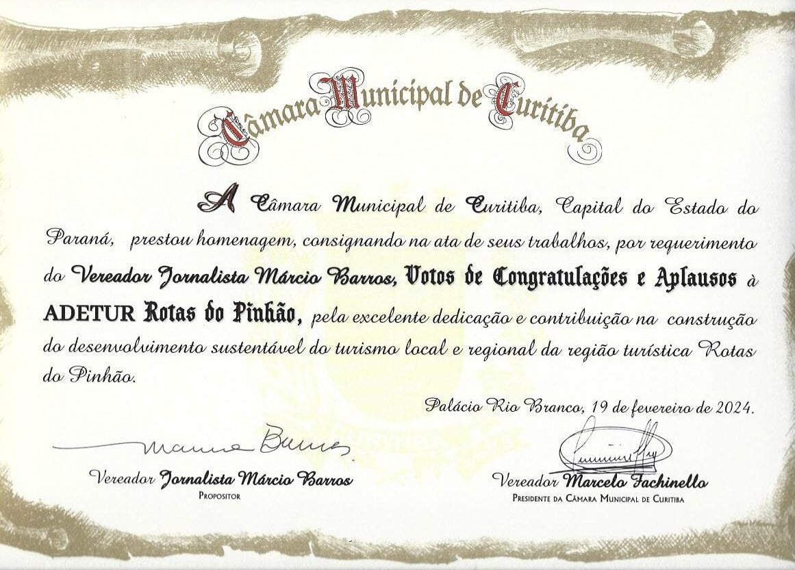 A ADETUR Rotas do Pinhão foi instituída no ano de 2015 a partir de uma Rede Empresarial com o apoio do SEBRAE, da Paraná Turismo e do Fórum Metropolitano de Secretários de Turismo. A entidade foi formatada com o propósito de ser a Instância de Governança da Região Turística Rotas do Pinhão como pode ser verificado em nossa ata de fundação da ADETUR (pdf). Atualmente a ADETUR Rotas do Pinhão detém título de utilidade pública municipal, conferido pela Câmara Municipal de Curitiba e também o título de utilidade pública estadual, conferido pela Assembléia Legislativa do Paraná.